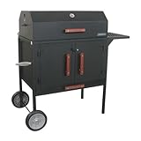 Big and heavy duty, the Black Dog 28 is built for serious BBQ'ers but easy enough to be used by anyone.Large front doors and removable ash tray make this grill easy to use.Heavy-duty steel construction.Heavy duty porcelain cooking grates.Crank adjustable charcoal grate to multiple positions.Over 510 square inches of cooking space.Large front doors for easy access to the fire and for adding wood.Large side shelf for workspace.Wood handles.Heavy duty wheels.Stainless steel temperature gauge.